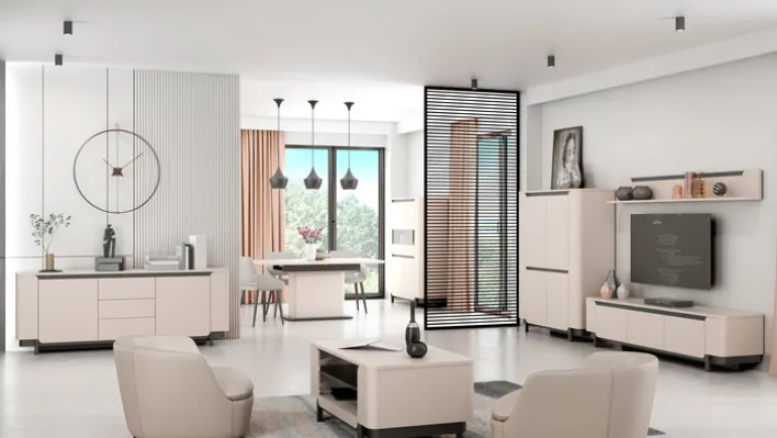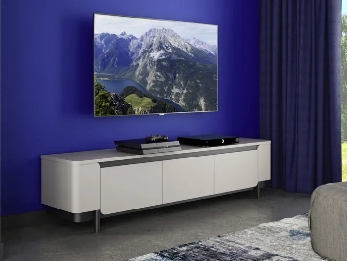 Das zweifarbige Lowboard VODOL mit einer Größe von 205 mal 49 cm ist mit drei Drehtüren ausgestattet. Das Soft-Close-System sorgt dafür, dass sich die Türen beim Schließen langsam in die Endposition bewegen.