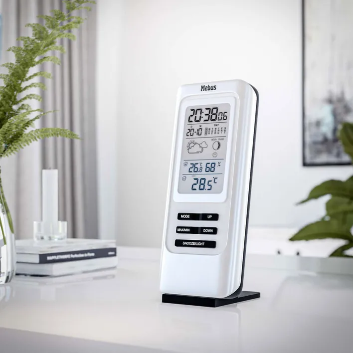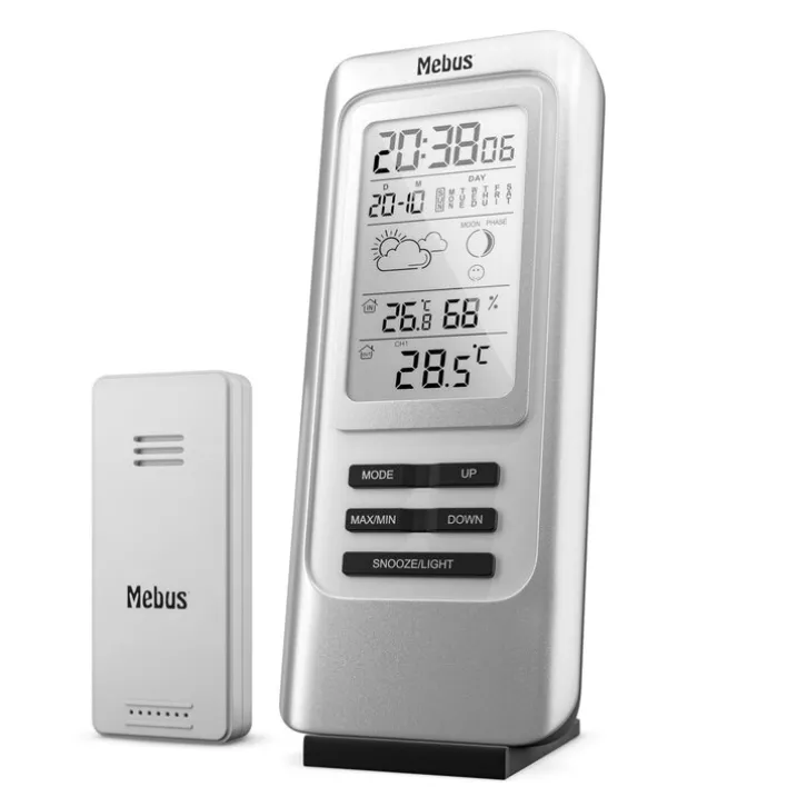 Die funkgesteuerte Mebus Wetterstation 40627 bietet eine Temperaturanzeige für Innen und Außen in wahlweise °C oder °F sowie ein Hygrometer für Innen und Außenbereich. Neben diesen Basisfunktionen und der Uhrzeit wartet sie mit Kalender und Wecker, Mondphasen-Anzeige und einer Wettervorhersage mit Symbolen auf. Ein Raumklima Sensor rundet die Funktionen der Wetterstation ab. Dank blauer Hintergrundanzeige sind die Messdaten gut ablesbar. Für den Betrieb sind zwei AA / zwei AAA-Batterien notwendig.