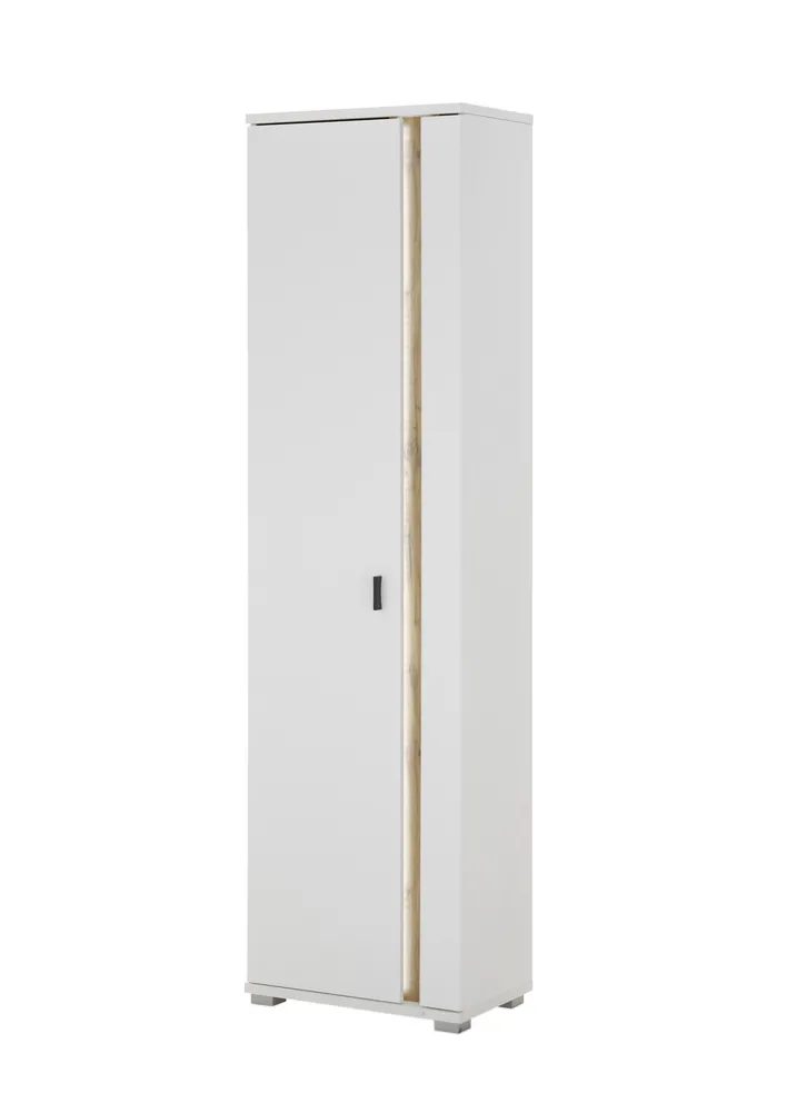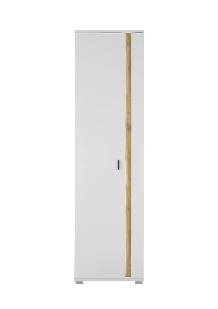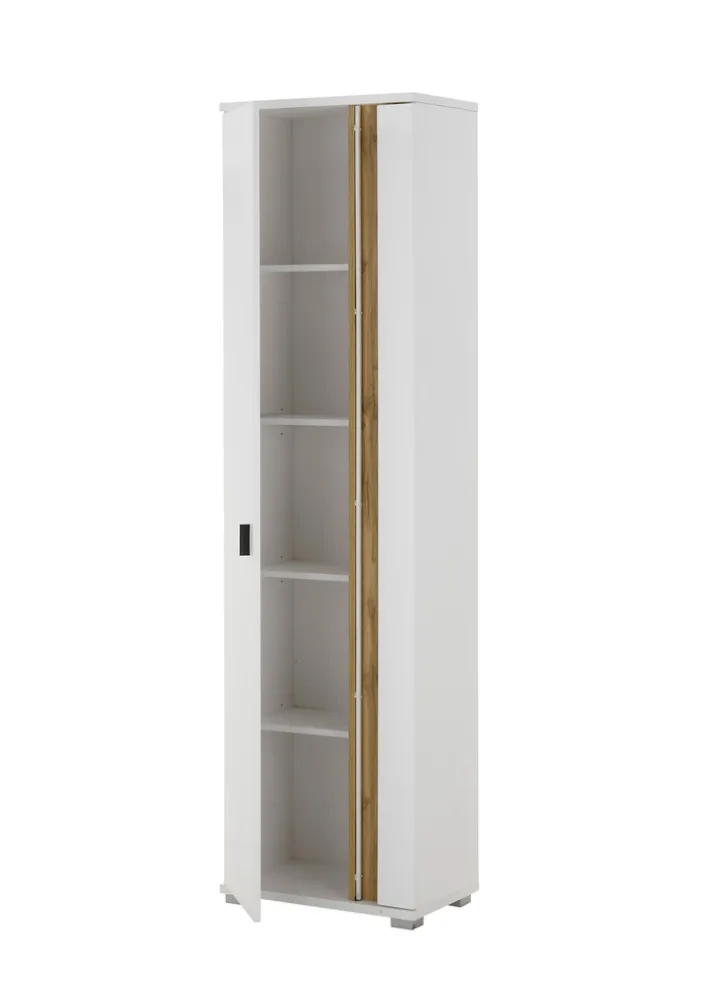 Der Schrank ist in einem ansprechenden Weiß gehalten, das durch Akzente in Eiche Wotan ergänzt wird, was ihm eine natürliche und warme Ausstrahlung verleiht. Die Kombination aus Weiß und Eiche passt sich nahtlos in unterschiedliche Wohnstile ein. Der