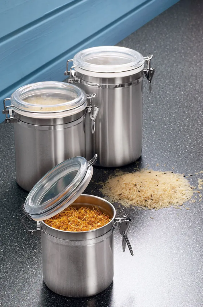 Die Vorratsdose und der hochwertig verarbeitete Bügelverschluss bestehen aus rostfreiem Edelstahl. Die Innen- und Außenseite der Dose sind matt gebürstet. Das verwendete Metall ist lebensmittelecht und säurebeständig. Der Deckel der Vorratsdose ist aus Acryl gefertigt.