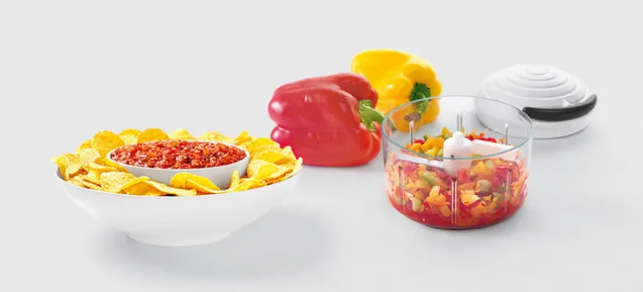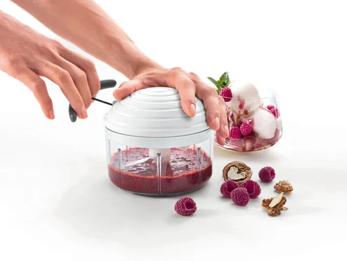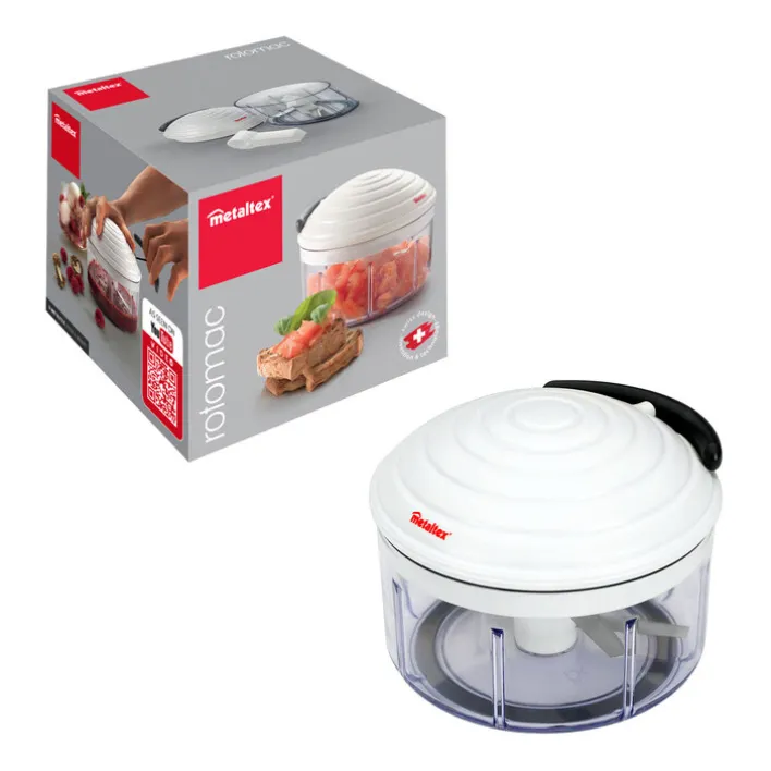 Der vielseitige Zerkleinerer von metaltex ist das ideale Küchengerät zum Mixen, Rühren und Raspeln in vier verschiedenen Schnittgrößen. Ausgestattet mit hochwertigen Klingen aus rostfreiem Edelstahl zerkleinert der ROTO MAC Gemüse, Obst, aber auch Nüsse zum Backen genau auf die gewünschte Größe. Durch den intelligenten Zugmechanismus ist er leicht zu bedienen und liefert immer gleichbleibende Ergebnisse. Auch zum Passieren von Suppen, Pesto, Desserts oder Soßen ist der Zerkleinerer gut geeignet.