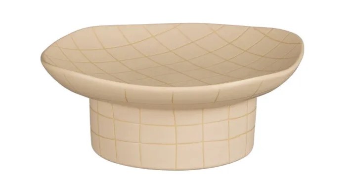 Die Schale steht auf einem großen Fuß, der ihr einen perfekten Halt verleiht. Ihr kariertes Design zieht sich über das gesamte Äußere, einschließlich Fuß. Dabei sind die Linien leicht unregelmäßig und sorgen für eine lebhafte Optik. Die beigefarbige Keramikschale eignet sich vor allem für die Präsentation von Obst oder Gemüse. Bestückt mit deren fröhlichen Farben sieht sie auf einem Ess- oder Couchtisch ebenso wie in der Küche besonders attraktiv aus.