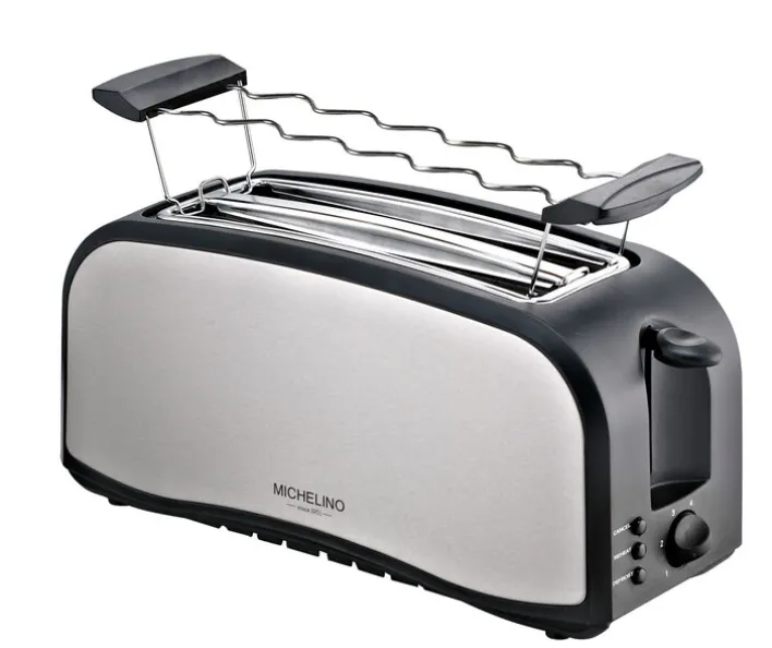 Der Langschlitztoaster besitzt eine Breite von 41 cm, so dass 2 x 2 Scheiben Toast mühelos in beiden Kammern Platz finden. Es können insgesamt 6 Bräunungsgrade gewählt werden. Ebenso besitzt der komfortable Toaster eine Stop-, eine Aufwärm- und eine Auftaufunktion. Doch nicht nur Toast, auch lange Graubrotscheiben oder aufgeschnittene Bagels erhalten den knackigen Biss. Die abnehmbare Brötchenauflage schützt Semmeln vorm Verbrennen während die herausnehmbare Krümelschublade das Säubern des MICHELINO 4-Scheiben Toasters erleichtert.