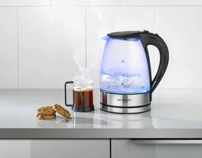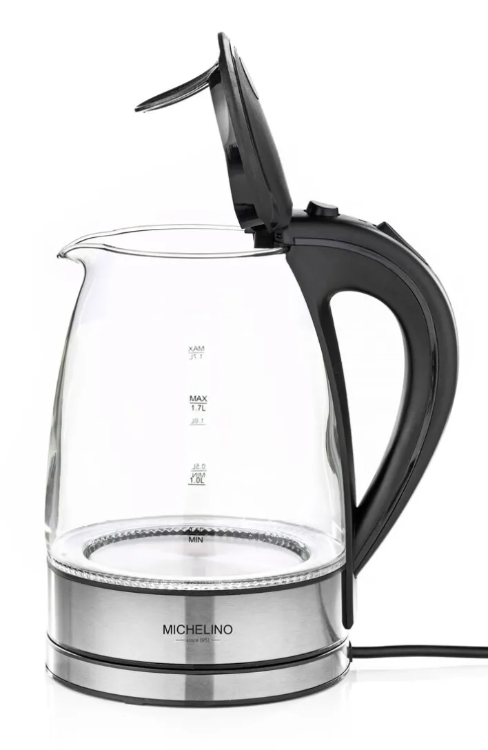 Der elegante MICHELINO Wasserkocher aus Glas, Kunststoff und Metall erhitzt im Nu Wasser für löslichen Kaffee oder Tee. Das Zubereiten von Babynahrung oder Instant-Gerichten geht genauso mühelos von der Hand.