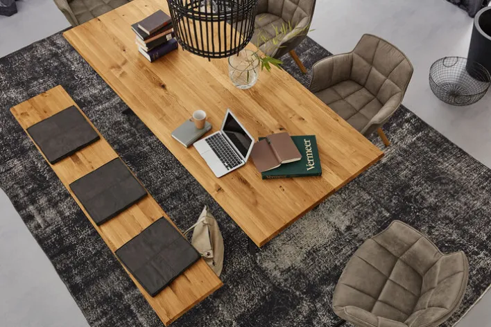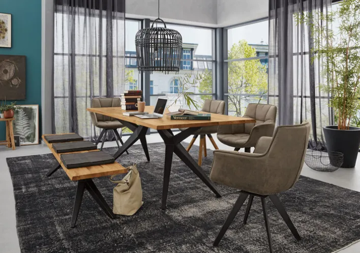 Die Tischplatte aus Eiche massiv und ein schwarzes Metallgestell verleihen dem Esstisch TAMINA 200 x 100 cm aus dem Hause Musterring eine stilvolle Ästhetik. Das ausgefallene Trapezgestell sorgt für viel Beinfreiheit und an der großen Holzplatte finden bis zu acht Personen gemütlich Platz.