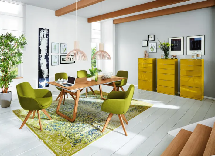 Der Musterring Esszimmerstuhl MR 8092 fällt dank seiner extravaganten Formgebung und dem frischen hellen Grünton des Bezugs einfach auf. Zudem ist der Stuhl sehr bequem, sodass sich in ihm viele Stunden ganz bequem verbringen lassen. Der Sessel verfügt über ein Vierfußgestell und ist drehbar.