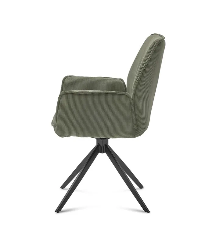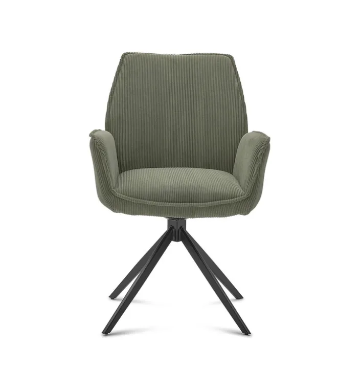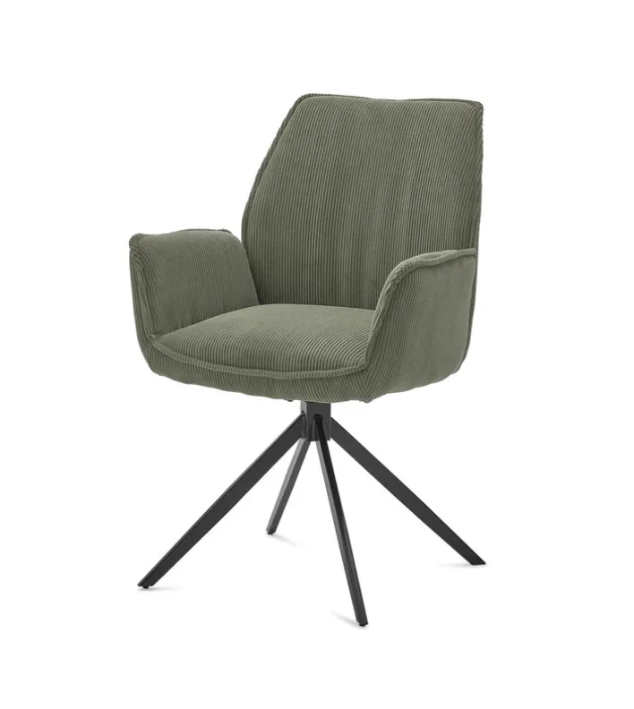 Für den Armlehnstuhl TIAMA hat Musterring hochwertige Materialien gewählt. Durch den Cordbezug wirkt der Stuhl ebenso zeitlos wie modern. Die Farbe Forest-Grün hat einen beruhigenden Effekt, sodass es am Esstisch oder beim Lesen leichter fällt, zur Ruhe zu kommen. Dazu kommt ein schwarzes Metallgestell, das im luxuriösen Stativdesign gestaltet ist. Technisch zeichnet sich der Stuhl TIAMA durch seine integrierte Wellenfederung im Sitz, eine Drehbarkeit um 180 Grad und eine Rückholfunktion aus.