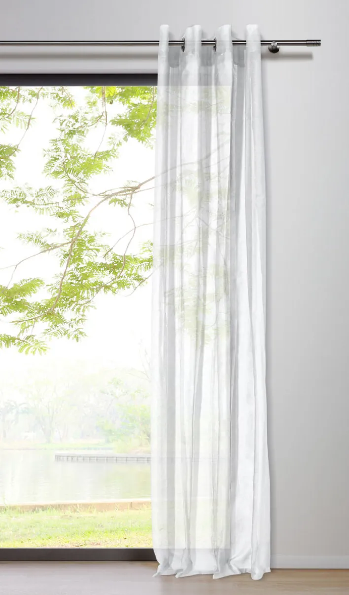 Fließende Transparenz: Der my deco Ösenschal SOFT 135 x 300 cm präsentiert sich hier in strahlendem Weiß. Er ist aus pflegeleichter Synthetikfaser und kann sofort aufgehängt werden.