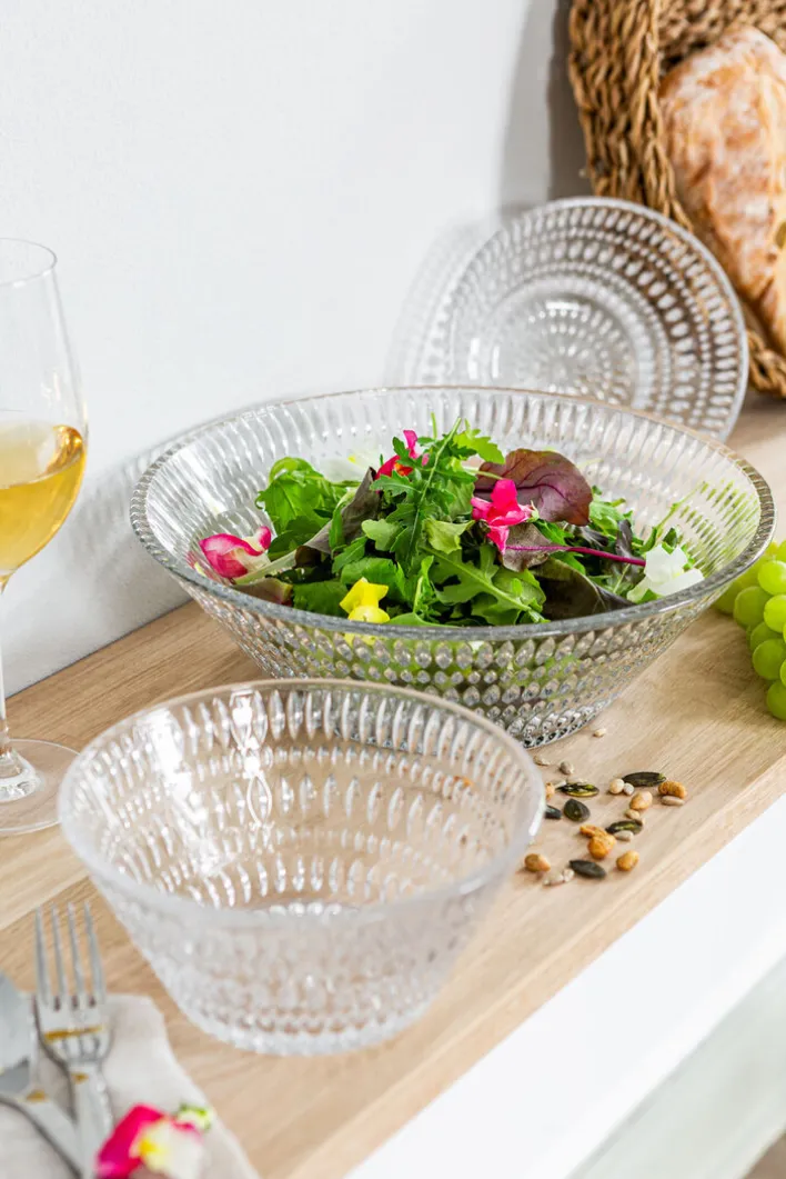 Aus wunderschönem, farblosem Kristallglas besteht das dreiteilige Schalen-Set ETHNO. Mit seiner faszinierenden Struktur bringt es beim Servieren eine bemerkenswerte optische Tiefe auf den Tisch.