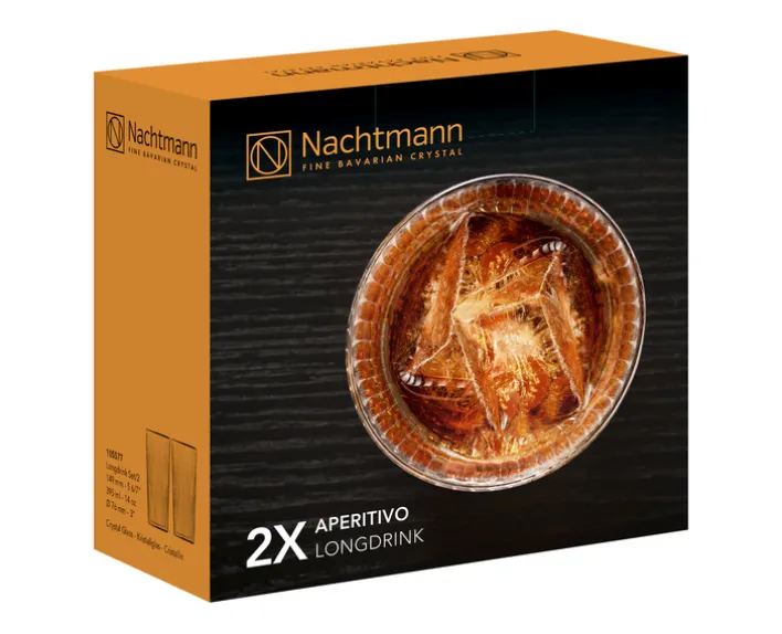 Das aus Kristallglas hergestellte 2er Trinkglas-Set APERITIVO von Nachtmann enthält zwei 395 ml Gläser, die ideal für Säfte und Longdrinks geeignet sind. Die hohe Formgebung der Gläser sorgt dafür, dass mehr spritzige Kohlensäure im Glas enthalten bleibt, zudem erlaubt die Silhouette auch viel Platz für Eiswürfel – die bei keinen leckeren Longdrinks fehlen dürfen.