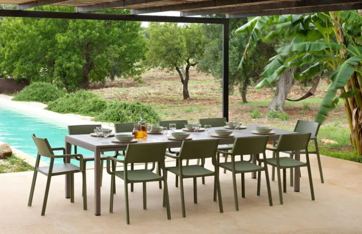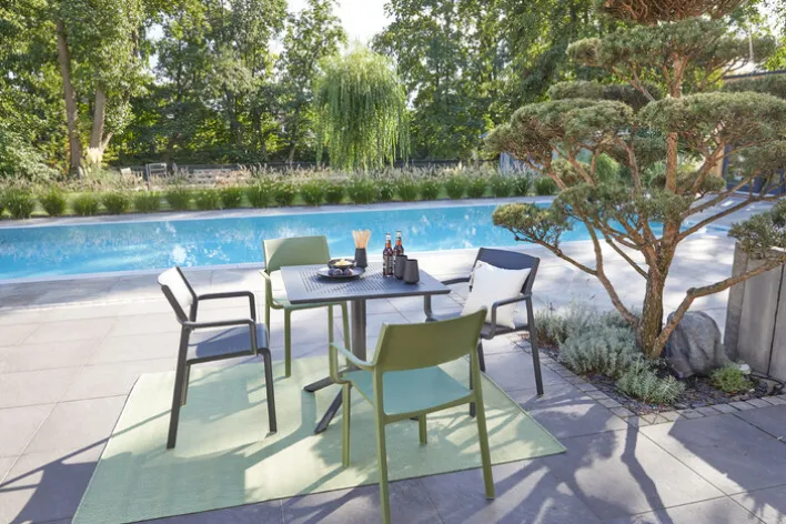 Mit dem NARDI Dining Gartenstuhl TRILL AL in der Farbe Agave lässt sich ein moderner Essbereich im Outdoorbereich gestalten, der mit stylischer Optik und gutem Sitzkomfort überzeugt.