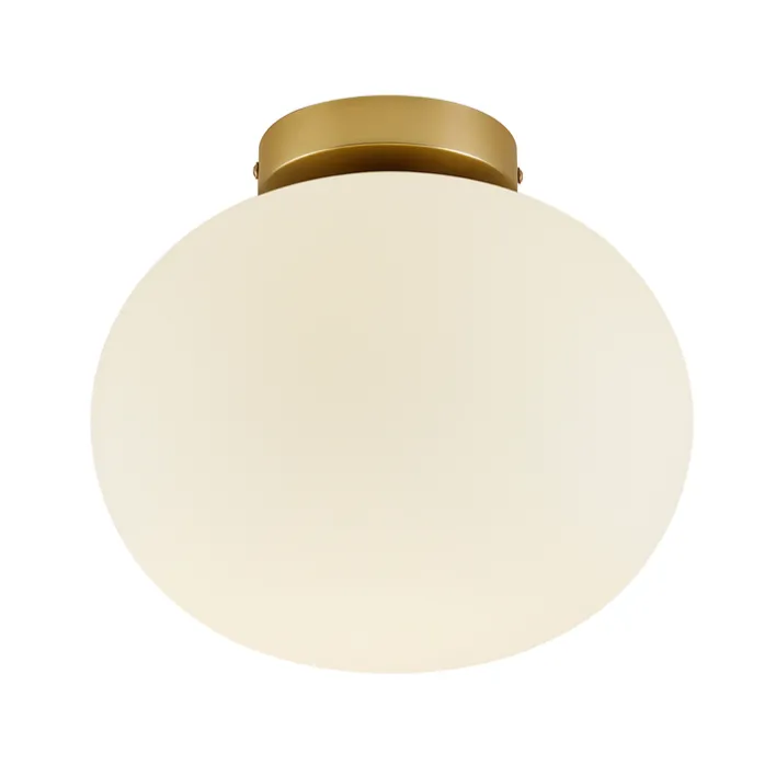 Die messingfarbige Retrofit Deckenlampe ALTON misst 27,5 cm im Durchmesser. Sie besteht aus Metall und Glas. Letzteres überzeugt zusätzlich durch seine mundgeblasene Qualität.