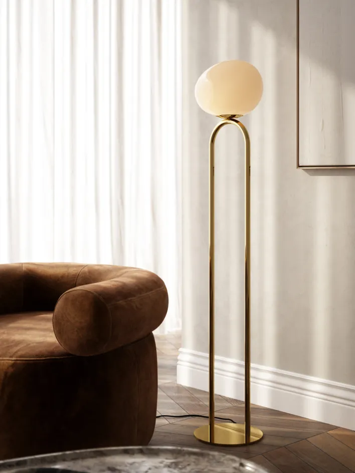 Gefertigt ist die messingfarbige, 135 cm hohe Retrofit Stehlampe SHAPES aus Metall und Glas. Auffällig an ihr ist das elegante Erscheinungsbild, das an die Schule des glamourösen Art Décos erinnert.