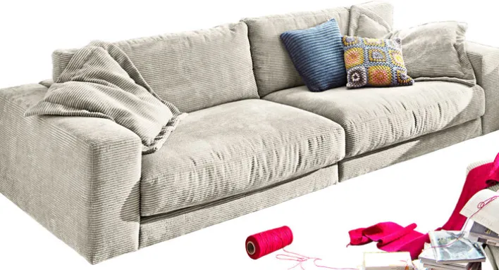 Mit dem 250 cm breiten Ole Gunderson Megasofa SEVENTIES mit Cord-Bezug in der Farbe Nature zieht ein stylischer Blickfang im Wohnzimmer ein, der mit hohem Sitzkomfort zum Verweilen einlädt.