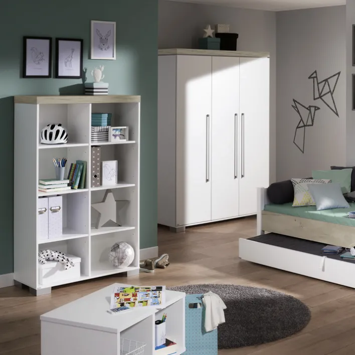 Der kreideweiße PAIDI Kleiderschrank bietet hinter seinen drei Drehtüren jede Menge Platz und Stauraum für ein ordentlich eingerichtetes Kinderzimmer.