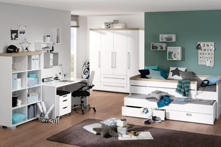Der PAIDI Schreibtisch KIRA besteht aus einer Holznachbildung in Kreideweiß. Die Holz-Dekorfarbe ist Eiche.