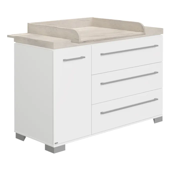 Die PAIDI Wickelkommode präsentiert sich in einem eleganten Kreideweiß. Sie ist ausgestattet mit einer Drehtür und drei Schubkästen.