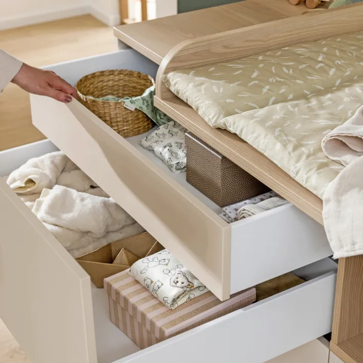 Die Wickelkommode MILA & BEN und die konisch geformten Füße besteht aus einem stabilen Holzwerkstoff. Das hochwertig verarbeitete Holz ist auf den Oberflächen in zwei Farben lackiert. Der Vollauszug und die Beschläge sind aus stabilem Metall hergestellt.