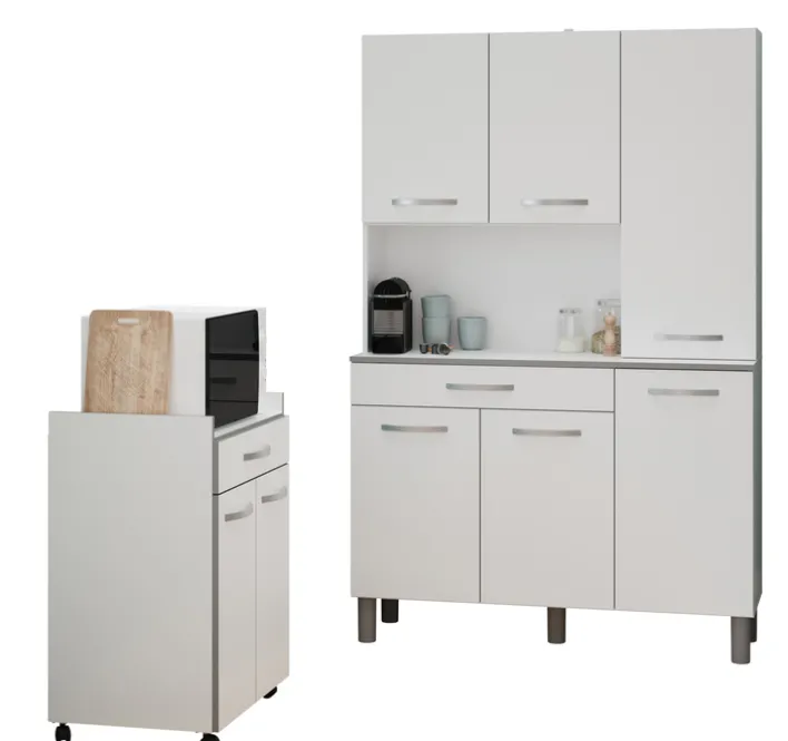 Mit dem Buffet Set Season 1 in den Farben Weiß und Grau von Parisot ist die Küche gut ausgestattet. Ein großes Buffet und ein Bestellschrank auf Rollen sorgen für viel Stauraum.