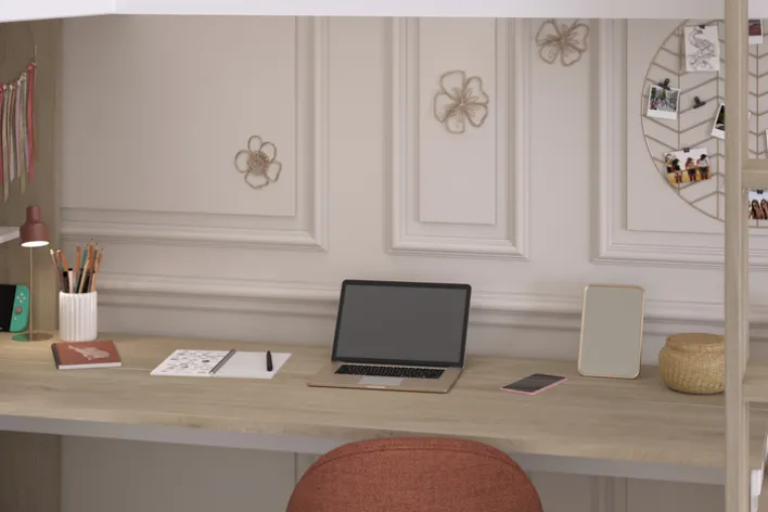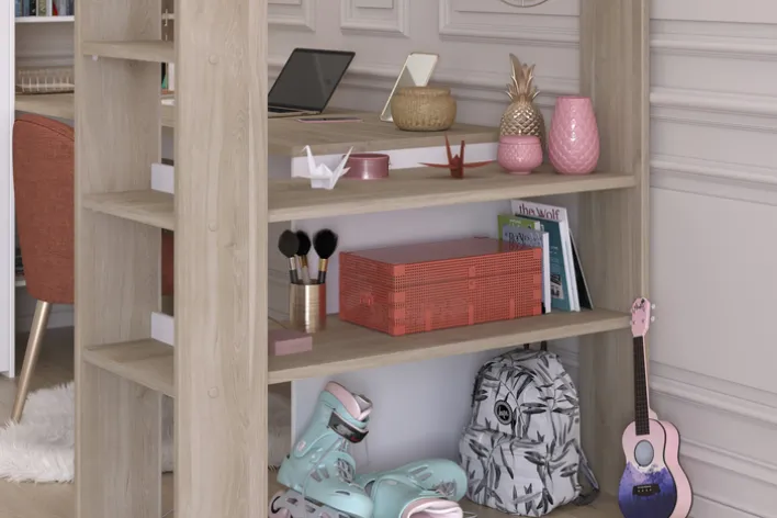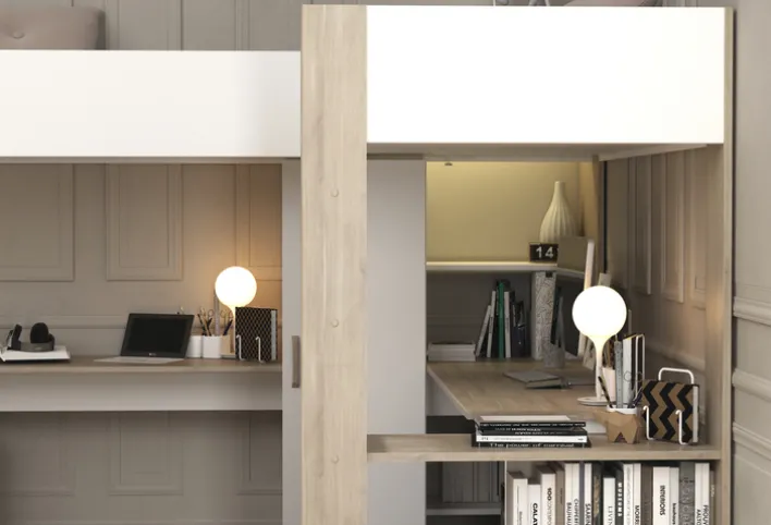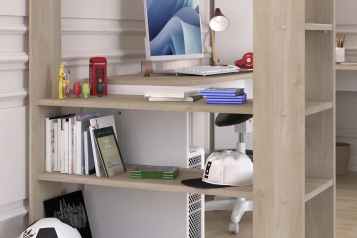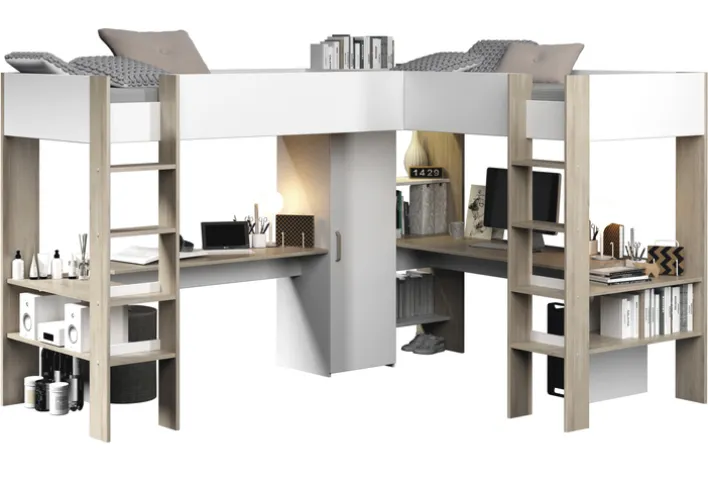 Unter den Liegeflächen befindet sich ein Mehrzweckschrank mit Drehtür und Einlegeböden. Zudem verfügt das Ensemble über zwei integrierte Schreibtische, die seitlich von praktischen Ablageflächen für Bücher, Spielzeug oder Schulmaterial ergänzt werden. Gefertigt aus einer robusten Holznachbildung in den Farben Braun und Weiß, zeichnet sich das Hochbett durch seine strapazierfähige und pflegeleichte Oberfläche aus.