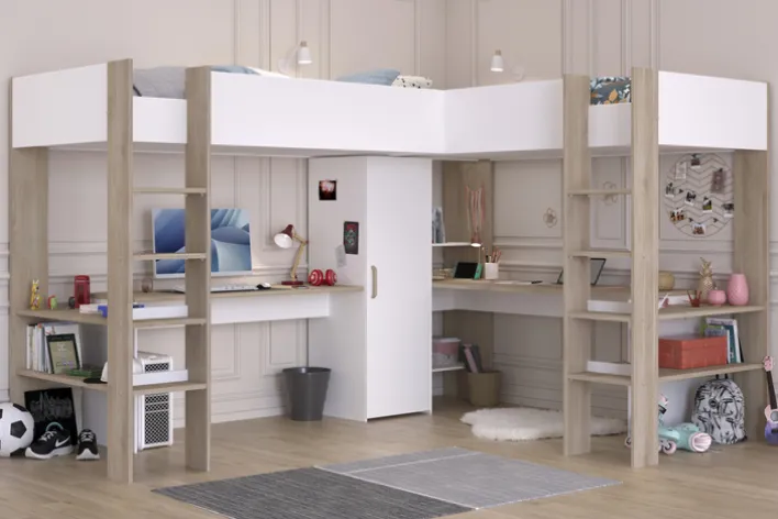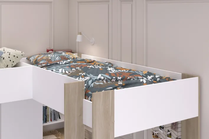Das Parisot Eck-Hochbett ALEX braun/ weiß bietet zwei über Eck liegende Schlafplätze in der Größe 90 x 200 cm. Die Schenkellängen betragen 295 cm und 231 cm, bei einer Gesamthöhe von 180 cm. Beide Schlafplätze sind über eine Leiter erreichbar, und die erhöhten Bettseitenwände sorgen für zusätzliche Sicherheit während des Schlafs.