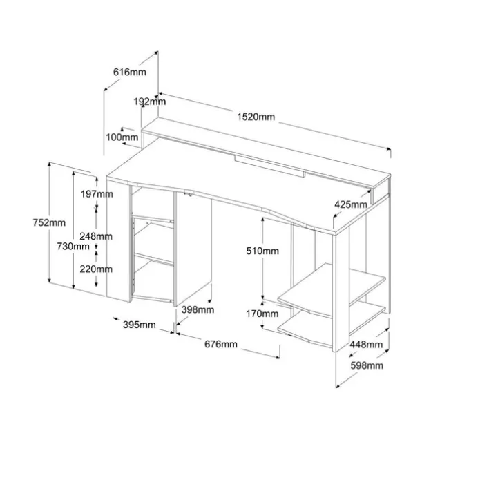 Der Parisot Gamertisch und die zwei Regale bestehen aus solider Holznachbildung und bestechen mit einer stylischen Optik. Auf dem Schreibtisch mit den Maßen 152 x 87 x 61,5 cm findet sich ausreichend Platz für Stand-PC, Tastatur und bis zu drei Bildschirme. Die Regale mit einer Größe von je 67 x 180 x 28 cm sind mit ihren schrägen Schranktüren und der LED-Beleuchtung Blickfang und Stauraummöbel in einem.
