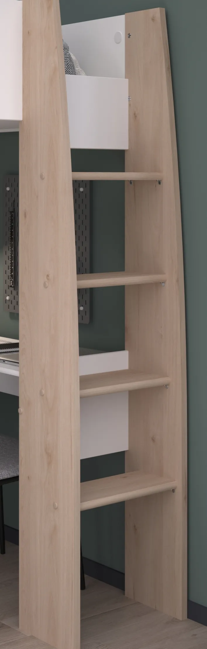 Es handelt sich um eine Holznachbildung in Jackson Eiche und Weiß. Das Hochbett ist 132 cm breit, 193 cm hoch und 204 cm lang. Es besitzt eine Liegefläche mit den Maßen 90 x 200 cm. Unter dem Bett befinden sich zusätzlich eine Garderobe und eine Ablageleiste. So bietet das Bett auf wenig Platz sehr viel Stauraum und eignet sich daher für kleine Räume.