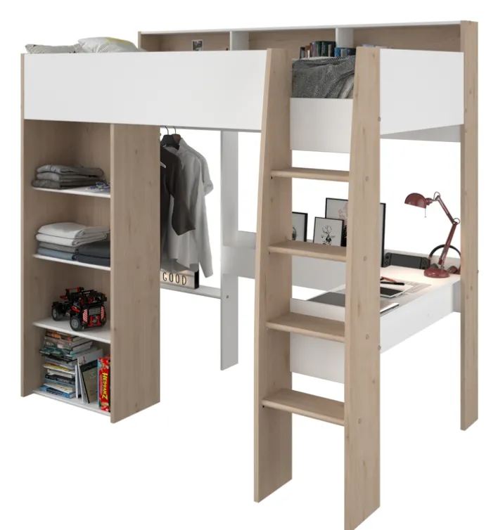 Das Parisot Hochbett SHELTER 11 ist in den Farben Braun und Weiß gehalten. Es wird ohne Matratze und ohne Lattenrost geliefert. Die Leiter ist im Lieferumfang enthalten. Dazu kommen ein Schreibtisch sowie ein Regal mit 3 Einlegeböden.