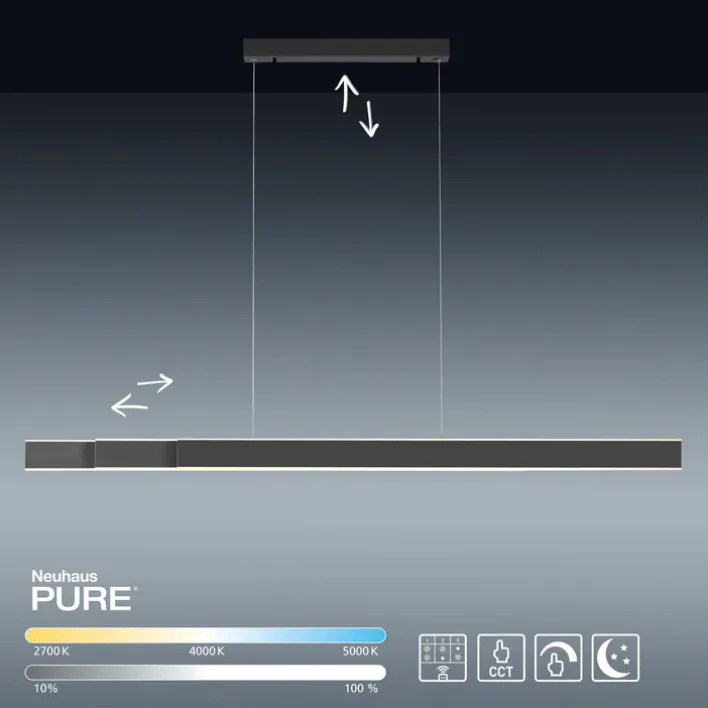 Dank der einstellbaren Farbtemperatur und Dimmfunktion lässt sich das Up & Down Licht der Pendelleuchte PURE-LUME der Marke Paul Neuhaus individuell anpassen und schafft eine angenehme Atmosphäre. Eine intuitive Gestensteuerung mittels der beiden Sensoren erleichtert die Bedienung. Durch die Memory-Funktion behält die Hängelampe die zuletzt gewählte Einstellung bei erneutem Einschalten bei. Das minimalistische Design fügt sich perfekt in moderne Wohnräume wie das Wohnzimmer, Esszimmer oder die Küche ein.