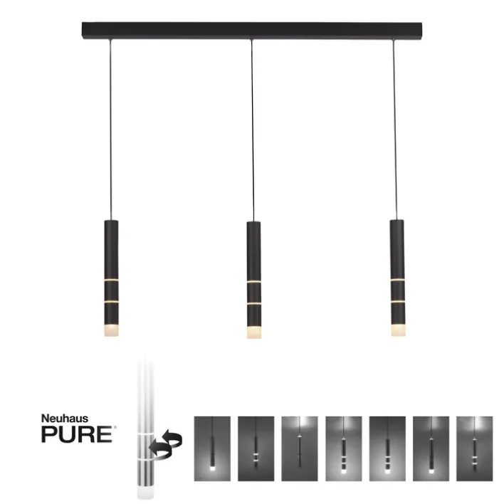 Das 3 kg schwere dreiflammige Paul Neuhaus LED Balkenpendel PURE-VEGA 120 cm schwarz ist 120 cm hoch bei einem Durchmesser von 5 cm. Die Hängeleuchte mit drehbarem Mittelelement besticht durch eine Besonderheit: Die eingebauten LED-Leuchtmittel lassen sich getrennt schalten und ermöglichen sieben unterschiedliche Lichtmodi für jede Stimmung.