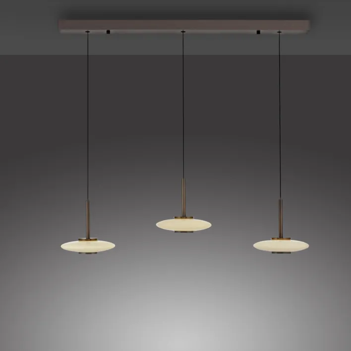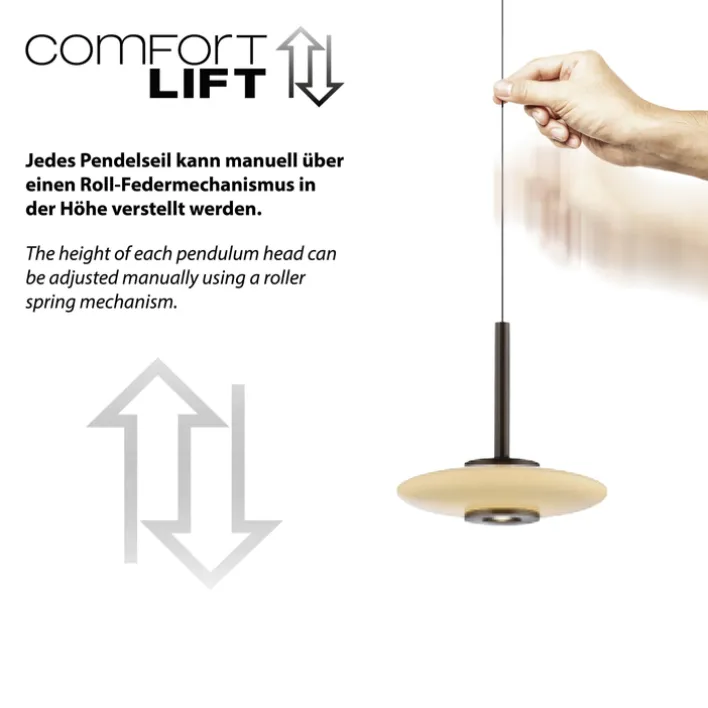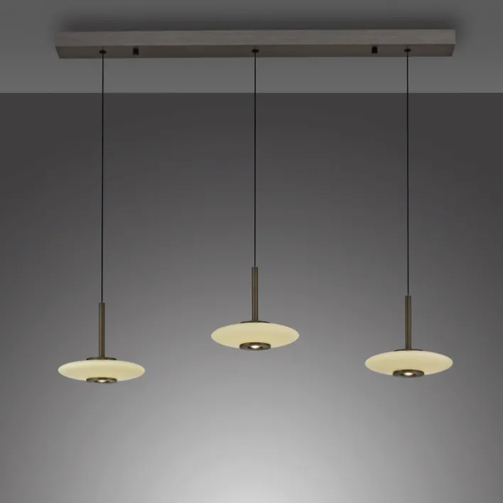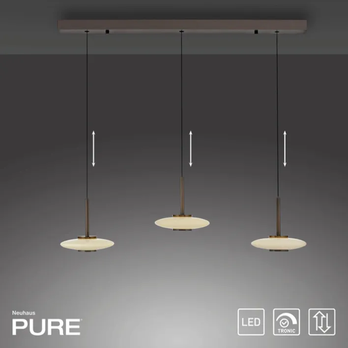 Zum LED Balkenpendel PURE VITRUM vom Label Paul Neuhaus gehören drei geschlossene Lampenschirme aus hochwertigem Opalglas. Mit ihrer flachen ovalen Form scheinen sie wie Objekte im Raum zu schweben. In jedem Schirm sind zwei LED-Leuchtmittel fest eingebaut. Eines davon hat eine Leistung von 5,1 Watt und das andere von 4,9 Watt. Zusammen ergibt das einen Energieverbrauch von rund 30 Watt sowie eine maximale Helligkeit von 3.399 Lumen, die über einen geeigneten Wanddimmer einstellbar ist. Via Roll-Federmechanismus lässt sich die Höhe der einzelnen Schirme zwischen 80 cm und 200 cm verstellen.