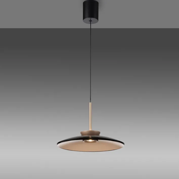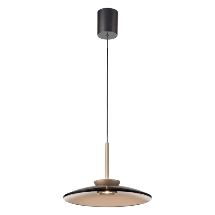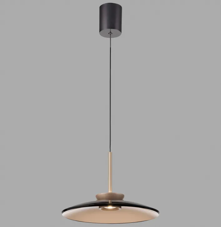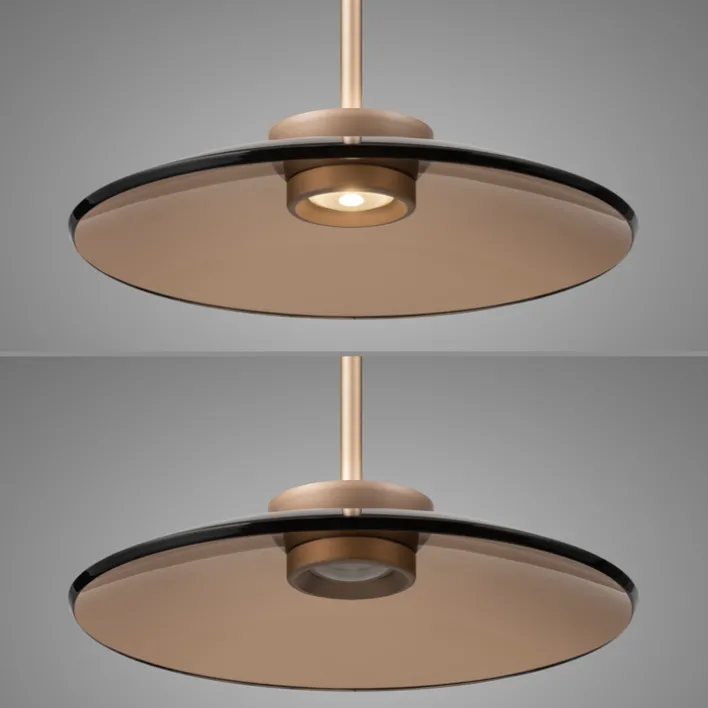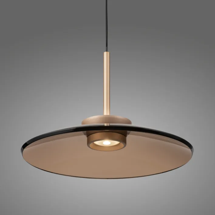 Die bronzefarbige LED Pendelleuchte PURE E-MOON mit 50 cm Durchmesser besteht aus Metall und getöntem Glas. Mit ihrer Up- & Downlight Funktionalität hat sie eine doppelte Lichtwirkung.