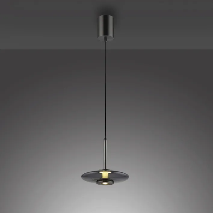 Die LED-Pendelleuchte PURE VITRUM 22 cm setzt sich aus grauem Metall und einem rauchfarbenen Lampenschirm aus Glas zusammen – eine elegante Lösung für vielfältige Innenräume! Funktional beeindruckt die Leuchte der Premiummarke Paul Neuhaus ebenfalls.