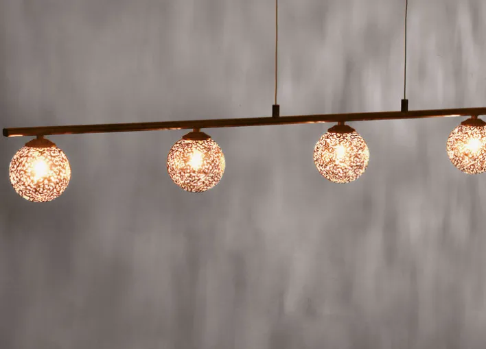 Die Paul Neuhaus Retrofit Pendellampe GRETA sorgt mit einem rostfarbigen Pendel, an dem fünf goldfarbige Kugeln befestigt sind, auf 132 cm für eine schöne Ausleuchtung des Esstisches. Mit ihrem filigranen Muster zaubern die Kugeln zudem wunderschöne Lichteffekte an Wand, Decke und Tisch. Zudem kann die Pendellampe in der Höhe verstellt werden. Für den Betrieb der CE-geprüften Pendelleuchte werden fünf Leuchtmittel mit G9 Fassung benötigt. Verwenden lassen sich 40 Watt Retrofit Glühbirnen ebenso, wie 8 Watt LED Leuchtmittel.