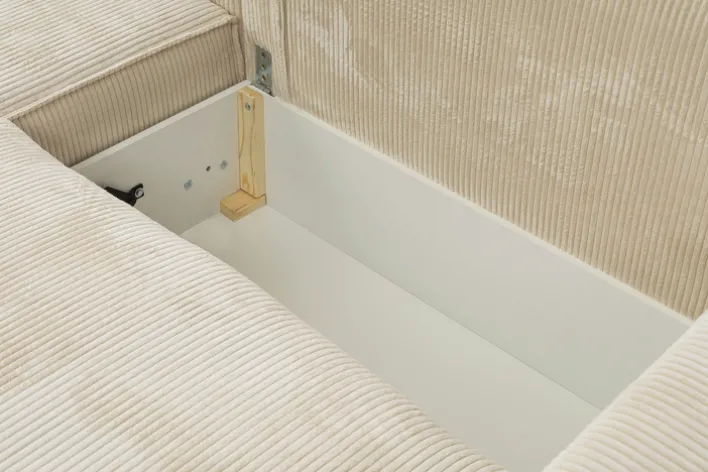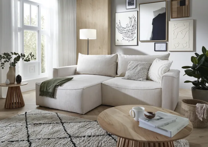 Das Ecksofa LILLY in Creme überzeugt durch sein stilvolles Design und eine hohe Funktionalität. Der Cordbezug verleiht dem Sofa eine gemütliche und einladende Optik, während die weiche Polsterung aus Schaumstoff auf einer Wellenunterfederung höchsten Sitzkomfort gewährleistet. Das Ecksofa ist universell und kann je nach Wunsch rechts oder linksseitig aufgebaut werden. Es kann auch zu einem späteren Zeitpunkt gewechselt werden.