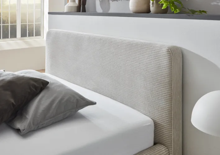 Da es über einen Bettkasten verfügt, lässt sich hier tagsüber das Bettzeug oder ein zweites Kissen samt Bettdecke und Zusatzdecke unterbringen. Das gesamte Bett ist 160 cm breit, 218 cm lang und zeigt eine Kopfteilhöhe von 105 cm. Hier kann man sich bequem anlehnen. Es ist mit 120 kg belastbar. Der Charme seines beigefarbigen Cord-Bezugs sorgt für ein angenehmes Raumgefühl.