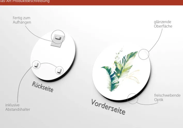 Auf der Rückseite sind eine Wandaufhängung sowie zwei Abstandshalter befestigt. Bei dem Material handelt es sich um hochwertig verarbeitetes Floatglas.