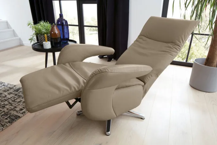 Der Sessel begeistert mit zahlreichen Extras, wie zum Beispiel einer Aufstehhilfe, einer motorischen Verstellung und einem mitlaufenden Armteil. Die Bedienung erfolgt bequem per Berührungssensor. Der Polsteraufbau setzt sich aus Polyätherschaum und Stahlwellenfedern zusammen, sodass auch langes komfortables Sitzen gewährleistet ist. Rückenlehne, Armlehnen und Sitzfläche sind mit echtem Leder bezogen, während der Sternfuß aus verchromtem Metall besteht. Aufgrund der gewählten Materialien und des minimalistischen Designs wirkt der Sessel sehr modern, sodass er vor allem in zeitgemäßen Einrichtungen gut aufgehoben ist.