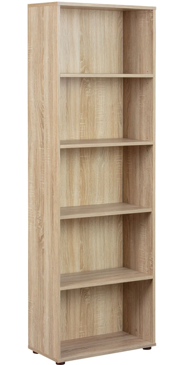 Das Regal JORIS ist 60 cm breit, 180 cm hoch und 30 cm breit. Vier Einlegeböden, das Sonoma-Eiche Dekor und schwarze Kunststofffüße zeichnen es aus. Das Regal wiegt 24,9 kg.
