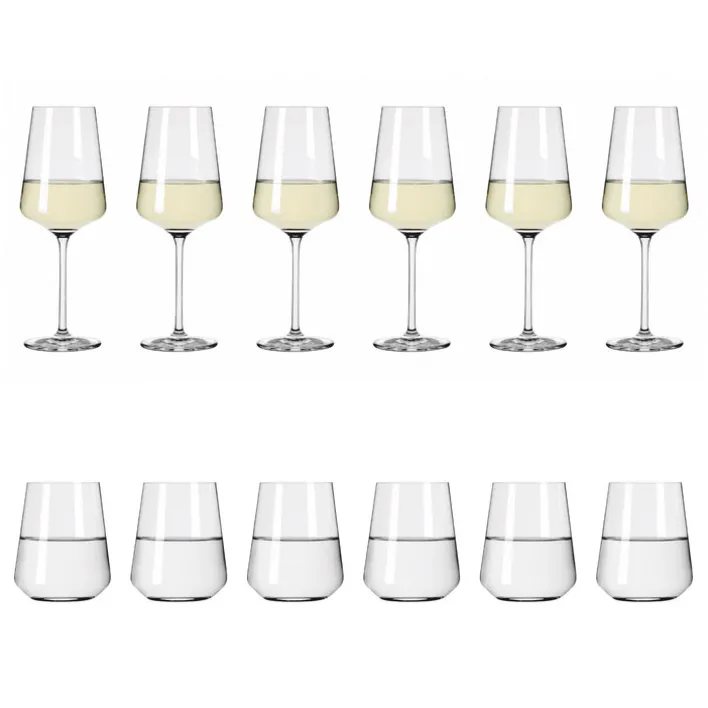 Das RITZENHOFF Wasser- und Weißweingläser-Set LICHTWEISS ist 12-teilig. Es besteht aus reinem Kristallglas. Im Set enthalten sind 6 Trinkgläser à 400 ml Fassungsvermögen und 6 Weißweingläser à 540 ml. Alle Gläser sind spülmaschinengeeignet.