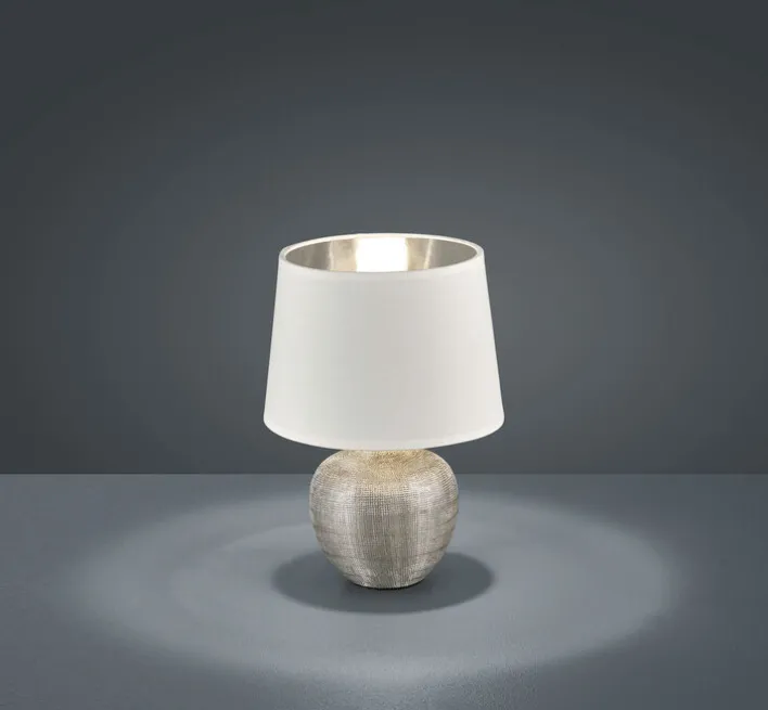 Diese schöne Tischlampe LUXOR hat einen silberfarbigen Keramikfuß, einen hellen, unifarbigen Textilschirm und ist circa sechsundzwanzig Zentimeter hoch.