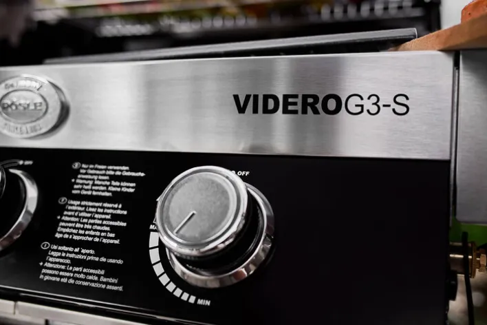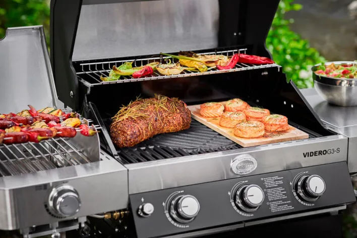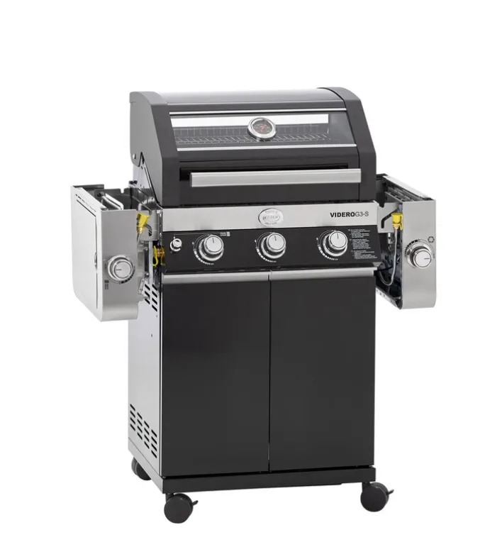 Der Gasgrill der Serie VIDERO G überzeugt mit einer Kombination aus schwarzem und silberfarbenem Design. Die Front und das Gehäuse bestehen aus pulverbeschichtetem Stahl sowie Edelstahl, was für eine robuste und pflegeleichte Oberfläche sorgt. Das Modell ist mit drei Hauptbrennern ausgestattet, die eine gleichmäßige Hitzeverteilung ermöglichen. Die großzügige Grillfläche wird durch seitliche Ablagen ergänzt, die zusätzlichen Platz für Grillzubehör bieten. Ein integriertes Thermometer im Deckel erlaubt eine präzise Temperaturkontrolle während des Grillvorgangs.