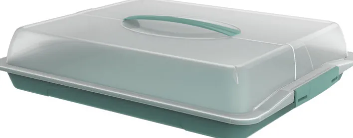Der praktische Kuchenbehälter FRESH überzeugt mit Schweizer Markenqualität. Er besteht aus BPA-freiem Kunststoff und ist lebensmittelecht. Das Unterteil der kratzfesten Form hat einen Wellenboden. Durch die transparente Abdeckhaube ist der schmackhafte Inhalt der Box erkennbar. Mit seitlichen Clip-Verschlüssen wird der Deckel sicher am Boden des Party-Butlers befestigt. Der Tragegriff ist im Deckel integriert.