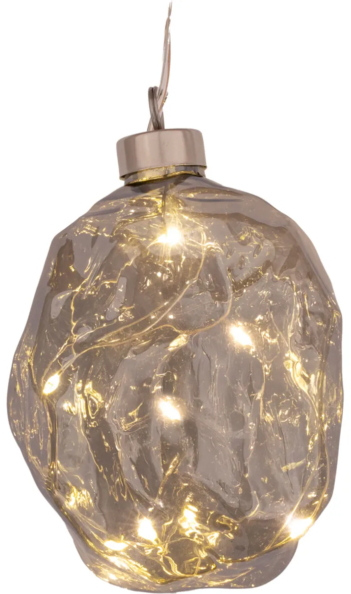 Das Design erinnert an eine modern interpretierte Kugelform mit einer metallischen Aufhängung am oberen Ende. Der Anhänger eignet sich für den Einsatz im Innenbereich und fügt sich durch seine dezente Farbgebung und die besondere Oberflächenstruktur in verschiedene Einrichtungsstile ein. Die Materialwahl Glas und die sichtbare Lichtquelle im Inneren unterstreichen den dekorativen Charakter des Produkts.