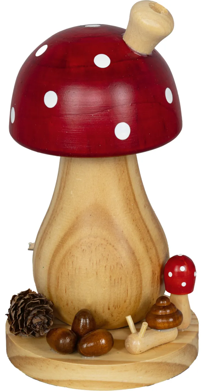 Dieses Deko Objekt aus Holz stellt einen detailreich gestalteten Pilz dar. Der große Pilzhut ist kräftig rot lackiert und mit weißen Punkten versehen, was an einen Fliegenpilz erinnert. Der Stamm sowie die Basis sind naturbelassen und zeigen eine sichtbare, glatte Holzmaserung. Auf der runden Holzplatte befinden sich zusätzlich weitere kleine Dekoelemente wie eine Schnecke, ein kleiner Pilz, Eicheln und ein Zapfen, die das natürliche Erscheinungsbild unterstreichen. Die Maße betragen 17 cm in der Tiefe, 9 cm in der Breite und 9 cm in der Höhe. Das Objekt eignet sich ausschließlich für den Innenbereich und ist als dekoratives Element konzipiert.
