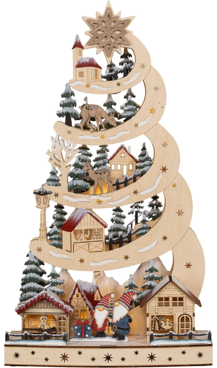 Dieses Lichtobjekt aus der Serie Wichtelweihnacht besteht aus Holz und ist für den Innenbereich geeignet. Mit einer Höhe von 9 cm, einer Breite von 27 cm und einer Tiefe von 48 cm präsentiert es ein mehrfarbig gestaltetes, detailreiches Winter- und Weihnachtsmotiv. Die Szenerie zeigt verschneite Tannen, Holzhäuser, ein Reh, eine Kirche sowie zwei Wichtel mit Geschenken, ergänzt durch zahlreiche kleine Details wie Geschenkpakete, eine Laterne und winterliche Schneelandschaften. Die Form ist spiralförmig mit einer großen, sternförmigen Spitze und mehreren Ebenen, die verschiedene Szenen darstellen. Die Farbausführung kombiniert naturbelassenes Holz mit Akzenten in Rot, Blau, Weiß und Grün.