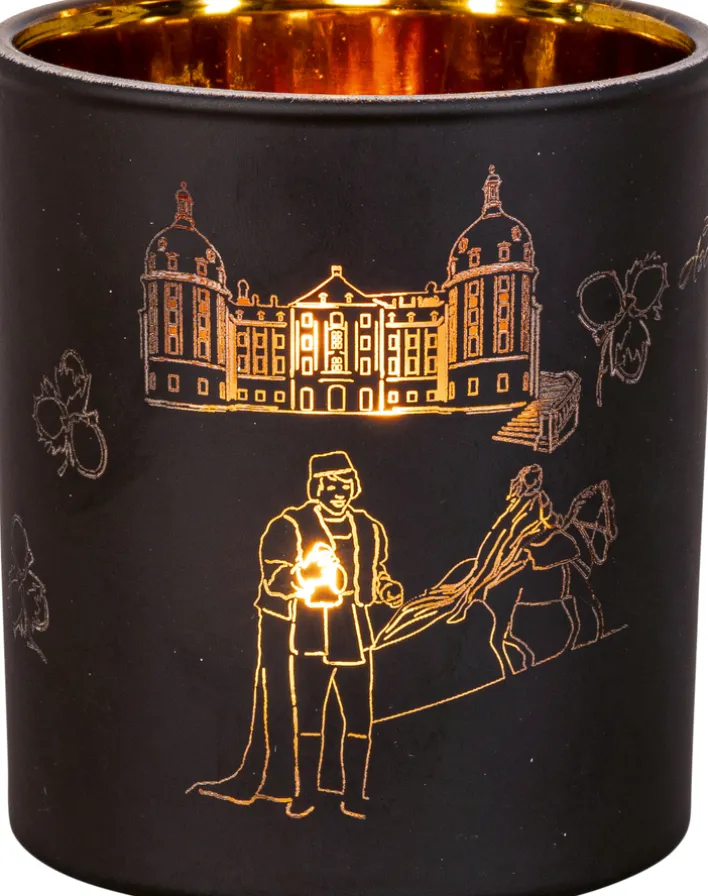 Dieser Teelichthalter aus Glas besitzt eine zylindrische Form mit einer Höhe von 9 cm, einem Durchmesser von 8 cm und einem Gewicht von 0,245 kg. Die Außenseite ist in mattem Schwarz gehalten und zeigt goldfarbene, filigrane Illustrationen, darunter ein Schloss, eine Figur mit Laterne sowie eine Kutsche mit Pferd und weitere feine Motive. Die Innenseite ist in glänzendem Gold gestaltet, wodurch das Kerzenlicht warm reflektiert wird. Das Design orientiert sich an Motiven aus dem Märchen ‚Drei Haselnüsse für Aschenbrödel‘ und eignet sich für den Innenbereich.
