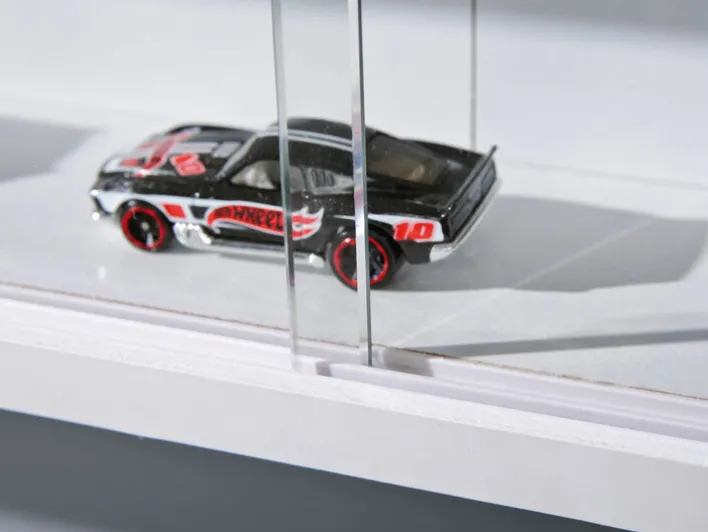 Die Glasfront der Sammlervitrine ADAM lässt sich aufschieben. Dafür ist die mittlere Verschlussseite mit praktischen Griffmulden ausgestattet. Korpus und Einlegeböden aus lackierter Spanplatte sind leichter als Holzmöbel. Dadurch hält auch eine weniger solide Wand den Schaukasten gut. Der Abstand der vier Einlegeböden ist ausreichend groß, um auch höhere Sammlerstücke einzustellen. Durch die solide Passform der Glastüren dringt kaum Staub zu den Stücken vor. Als Glassorte wurde für die Vitrine transparentes Klarglas verwendet.
