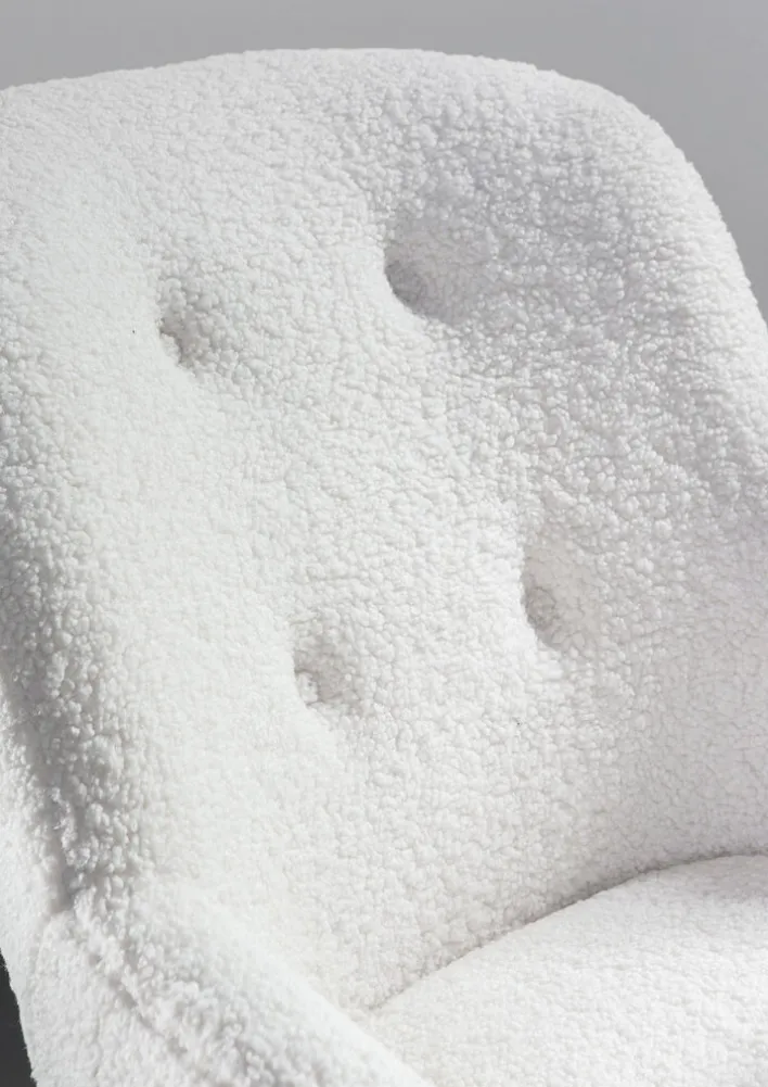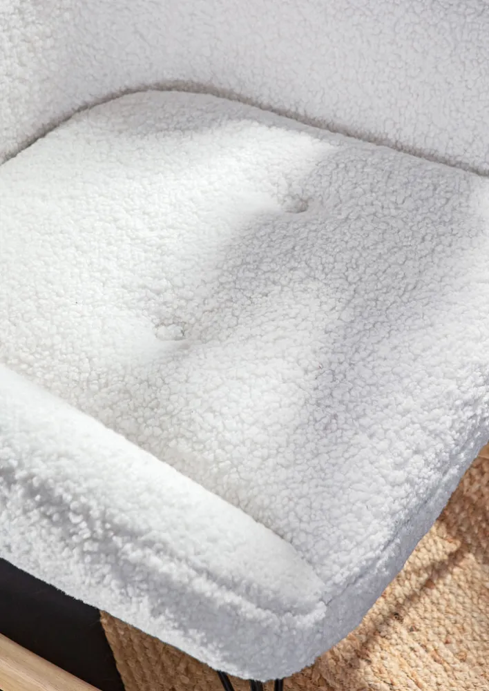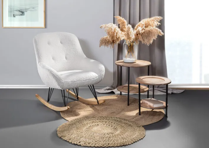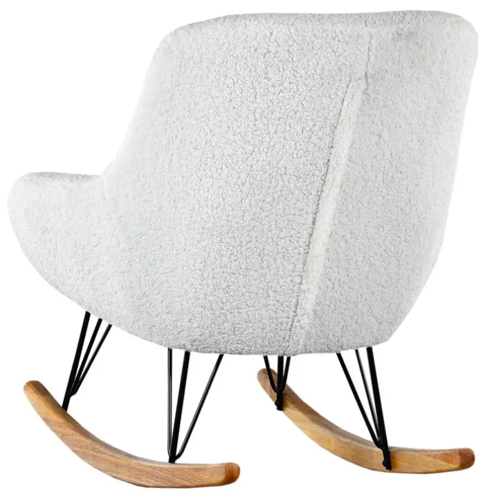 Der Schaukelsessel aus der Serie WOLLY vereint modernes Design mit hohem Komfort. Mit einer Breite von 75 cm, einer Höhe von 88 cm und einer Tiefe von 95 cm bietet er großzügigen Platz zum Entspannen. Der Sessel ist in einem eleganten Weiß gehalten, das sich harmonisch in verschiedene Wohnstile einfügt. Die Oberfläche aus weichem Textil, bestehend aus 100 % Polyester, sorgt für ein angenehmes Sitzgefühl. Die fest gepolsterten Armlehnen bieten zusätzlichen Komfort.