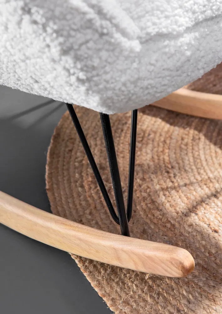 Das Kufengestell aus massivem Eichenholz und pulverbeschichtetem Metall verleiht dem Sessel Stabilität und eine moderne Optik. Die Kombination aus Holz und Metall unterstreicht den zeitgemäßen Stil des Möbels. Die lackierte Oberfläche des Holzes sorgt für eine langlebige und pflegeleichte Nutzung. Dieser Schaukelsessel ist nicht nur ein Blickfang, sondern auch eine praktische Ergänzung für jedes Wohnzimmer.